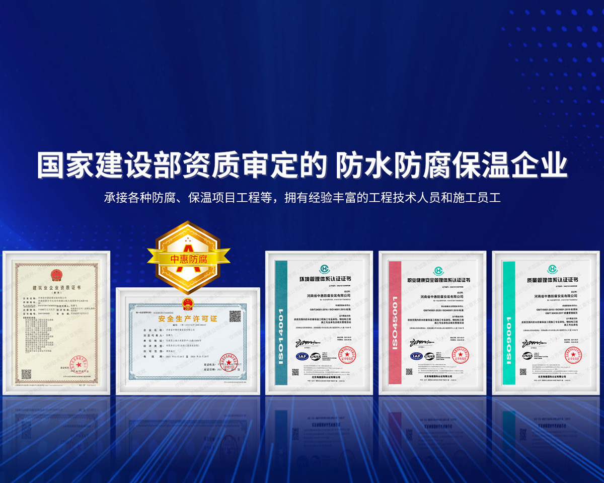 公司經營范圍:防水防腐保溫工程;消防設施工程;建筑裝修裝飾工程;建筑機電安裝工程;電力工程;建筑工程;石油化工工程;工業清洗工程;油罐清洗工程;鋼結構工程;環保工程;模板腳手架工程;電纜防火封堵、防污閃噴涂、外墻外保溫工程;各類施工勞務作業;設備維修、船舶鉚焊、涂裝;電力工程材料、建材、防水材料、防火材料、防腐保溫材料銷售,并相繼通過了GB/T19001-2008idtISO9001:2008GB/T50430-2007質量管理體系認證證書。GB/T24001-2004idtISO14001:2004環境管理體系認證證書。GB/T28001-2011idtOHSAS18001:2007職業健康安全管理體系認證證書。公司是中國防腐蝕于防護協會、中國施工企業管理協會、電力協會和中國鋼結構防水協會會員單位。 公司的經營業務涵蓋了石油、化工、電力、冶金、煤炭、船舶、國防、燃氣、水利、環保、交通運輸、航空及國防軍工和輕紡市政等行業的防腐保溫絕熱設備。鋼結構安裝、防火、防水、金屬噴鍍、聚脲噴繪、陰極保護、防滲透堵漏、玻璃鋼及各種磚版材料襯里、橡膠襯里、煙氣硫和耐酸溶劑腐蝕等工程施工。公司連續十年榮獲“省市先進施工企業”“安全生產先進單位”“重合同,守信用企業”和“AA***資質企業”的稱號。2000年被命名為市級文明單位,2002年被國家工商行政管理局命名為“重合同,守信用的企業”、被中國工業防腐蝕技術協會命名為“防腐蝕企業,能源節約及環境保護領域有豐富的經驗和***的業績。工程一次交驗合格率100%。其中攀枝花鋼鐵公司煉鐵廠四號高爐及熱風爐防腐工程、上海寶鋼公司煤氣柜防腐工程、撫順石油一廠裝置防腐項目、齊魯石化公司稀烴廠高塔防腐工程、吉林化學工業公司煉油廠油罐防腐工程、天津石化熱電廠六號爐頂棚聯絡管保溫工程、大慶油田(太倉)力神泵業工程、中國化學工程第十一建設工程、中原油田勘探局工程、中國石化銷售有限公司華北分部、魯皖輸油管道工程、貴州開磷息烽合成氨工程、陜西黃陵煤化工程、中國石油天然氣西部管道塔里木輸油工程、邯鋼集團邯寶鋼鐵公司煉鐵工程、德州供電工程、吉寶(南通)船廠工程,偃師華潤熱力工程、鄭州熱力總公司。 河南省中惠防腐安裝有限公司愿以豐富的施工經驗,***的技術,***的設備,***的管理,***的服務,竭誠為國內外廣大的用戶提供***滿意、******的工程作品。 我公司愿與國內外同仁一道,團結協作,共同推進防腐蝕行業發展! 公司地址:河南省長垣縣建設路北段360號 固定電話:0373-8866488 郵編:453400 網址:http://www_zhff_com_cn.jiaolengqieduan.com
